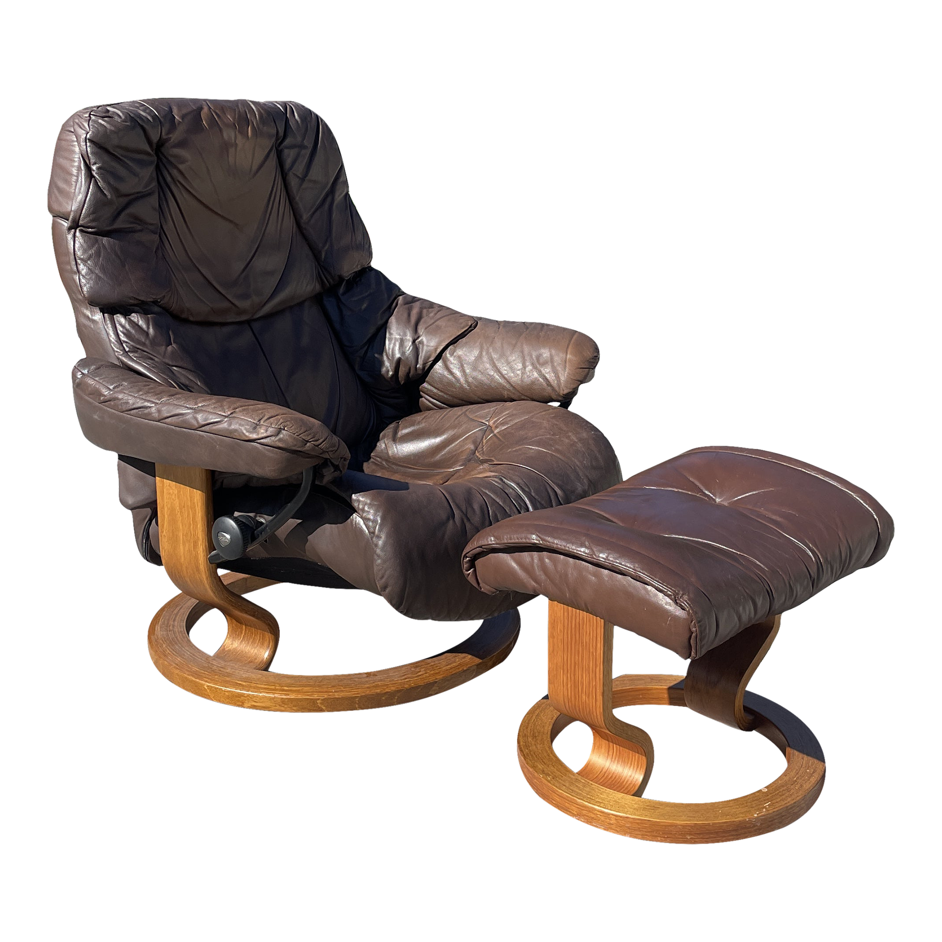 Vintage Ekornes Brown Leather Stressless Reno Chair And Ottoman Set Of 2 Chairish
